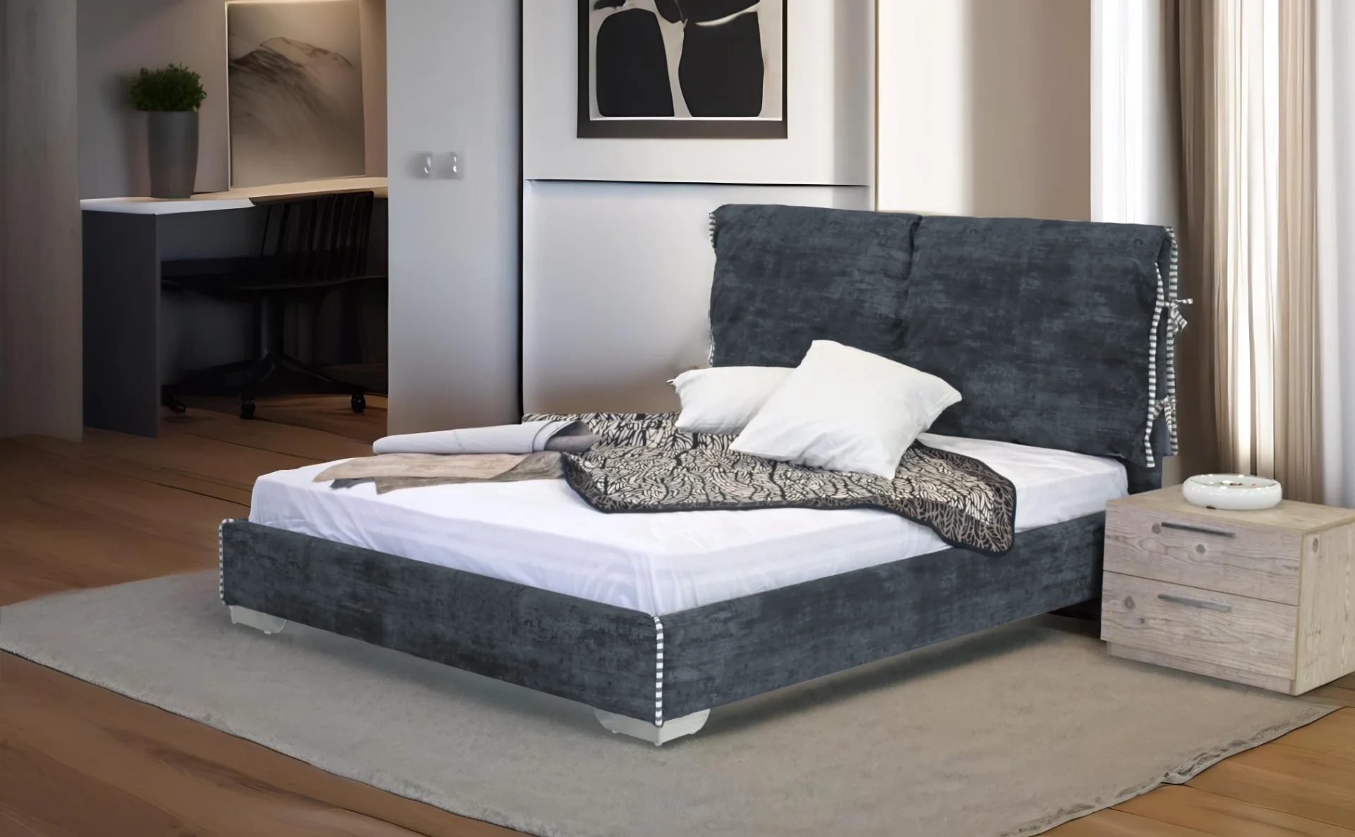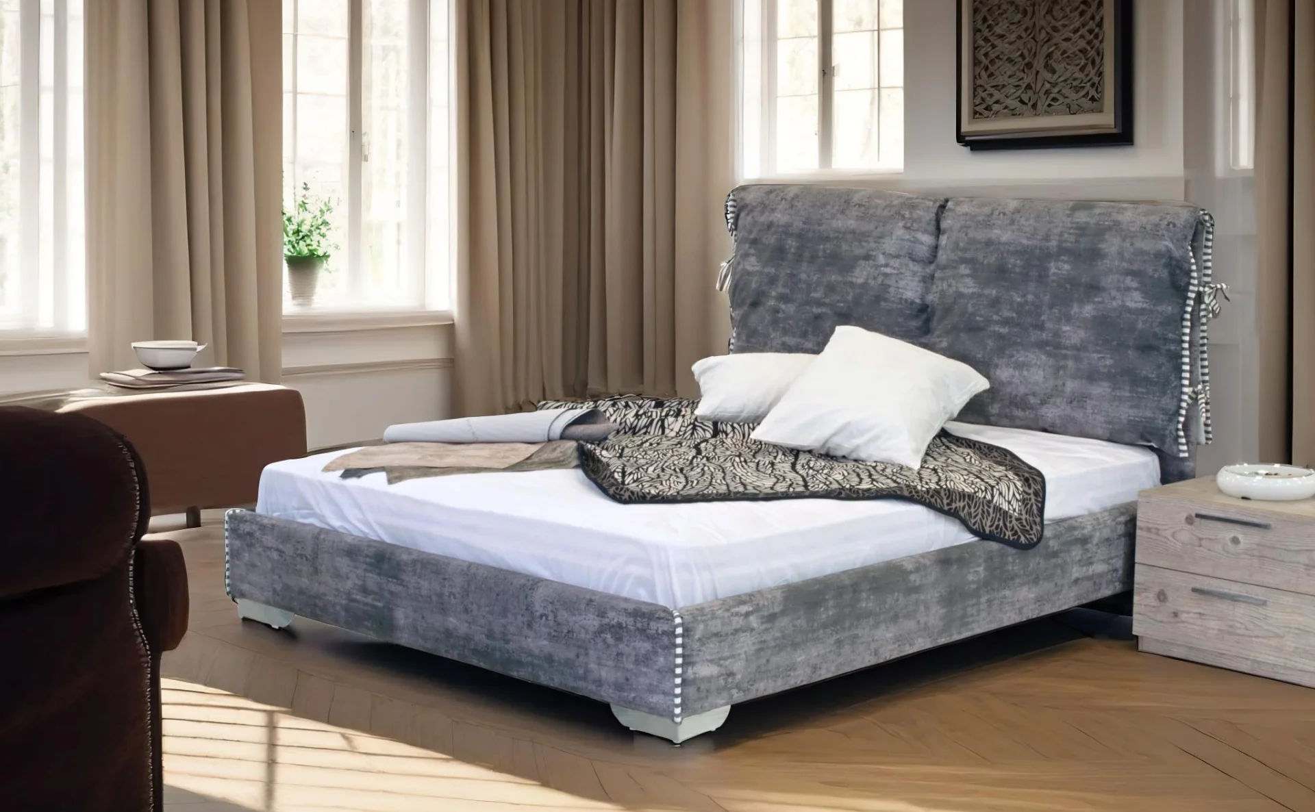 Η κρεβατοκάμαρα Jersey 82067 είναι ιδανική για τουριστικά καταλύματα που επιθυμούν να προσφέρουν στους επισκέπτες τους άνεση και κομψότητα. Με διάσταση στρώματος 200 x 160 cm, διαθέτει αποσπώμενα μαξιλάρια διπλής όψης για ευκολία στη συντήρηση. Προσφέρει δυνατότητα προσθήκης αποθηκευτικού χώρου, εξοικονομώντας πολύτιμο χώρο στα δωμάτια. Διατίθεται σε μεγάλη ποικιλία αδιάβροχων και αλέκιαστων υφασμάτων ή τεχνόδερμα, επιτρέποντας την προσαρμογή της στις αισθητικές προτιμήσεις του καταλύματός σας. Τα πόδια από Inox ή ξύλο προσδίδουν ανθεκτικότητα και στυλ. Η χειροποίητη κατασκευή της συνοδεύεται από 7ετή εγγύηση (εξαιρούνται τα υφάσματα), διασφαλίζοντας μακροχρόνια ποιότητα και αξιοπιστία.