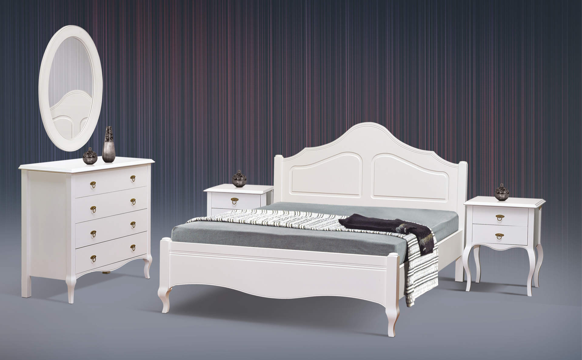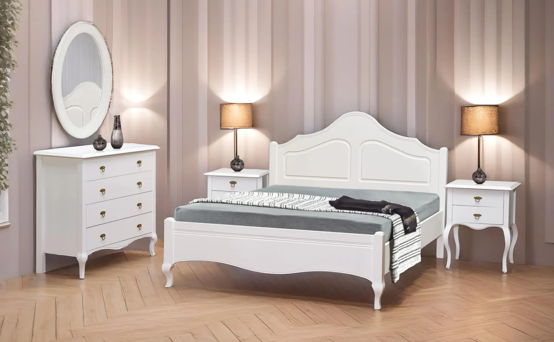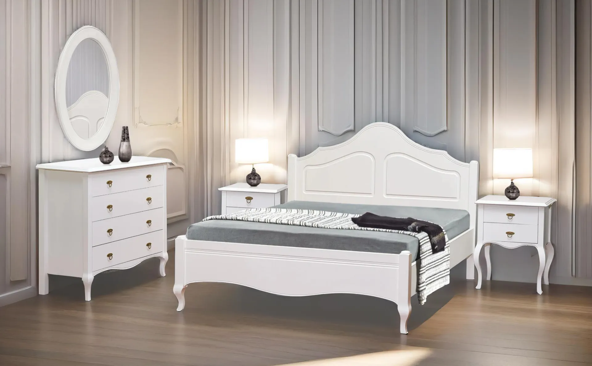Η κρεβατοκάμαρα VIENNA 82293 συνδυάζει κλασική αισθητική και πρακτικότητα, καθιστώντας την εξαιρετική επιλογή για τουριστικά καταλύματα με ρομαντικό ύφος. Το σχέδιο του κρεβατιού με τις καμπύλες γραμμές και το επιβλητικό κεφαλάρι προσφέρει διαχρονική κομψότητα. Το σετ περιλαμβάνει συρταριέρα με μεγάλο καθρέφτη και κομοδίνα που συμπληρώνουν το σύνολο, δημιουργώντας έναν ολοκληρωμένο και λειτουργικό χώρο. Ιδανική για να προσδώσει μια αίσθηση πολυτέλειας και φινέτσας στα δωμάτια φιλοξενίας σας.