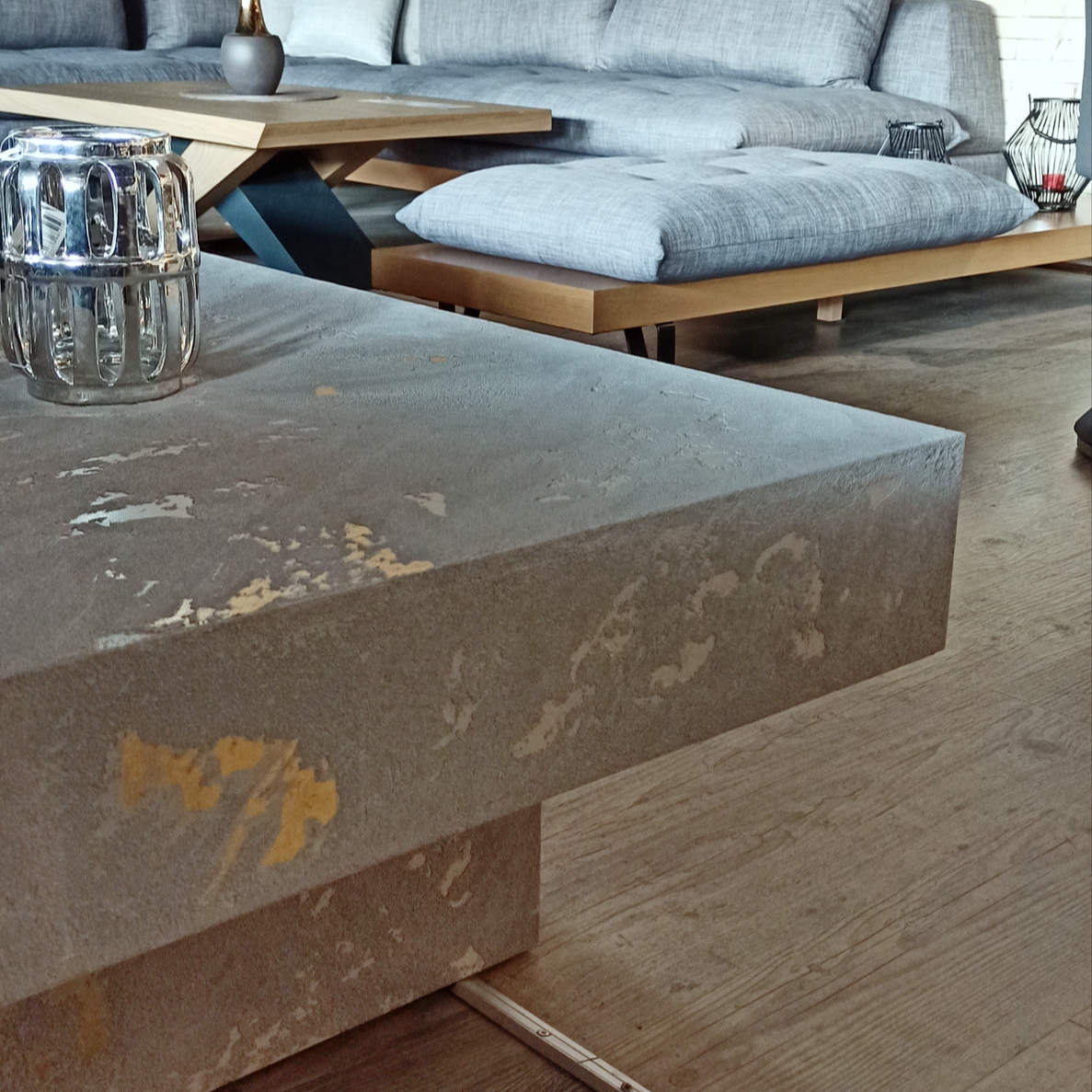 Κομψότητα και αντοχή συνδυάζονται άψογα σε αυτό το μοντέρνο τραπεζάκι σαλονιού με χρυσές λεπτομέρειες και φυσική υφή.